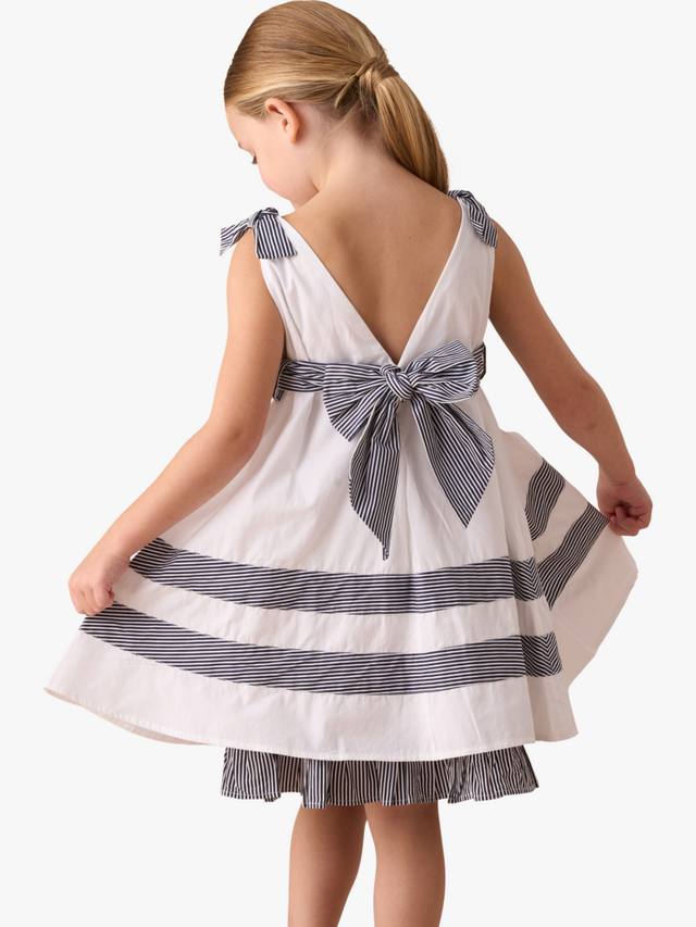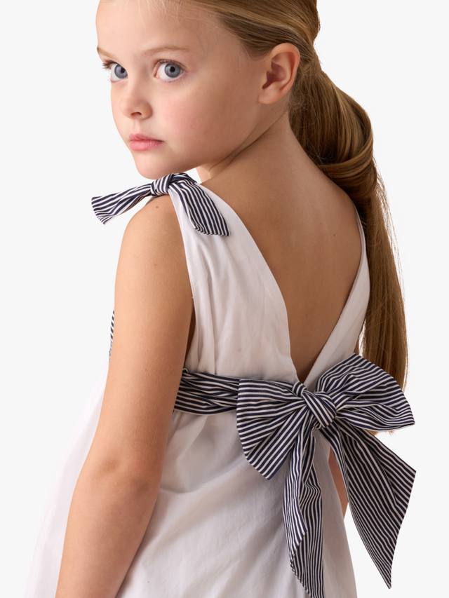Красивое свободное платье из полированного хлопка с симпатичными бретельками-бантиками и контрастными полосками в классическом белом и синем цветах.
