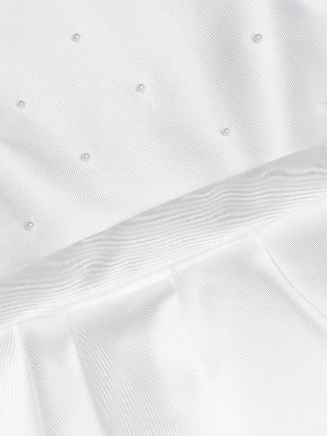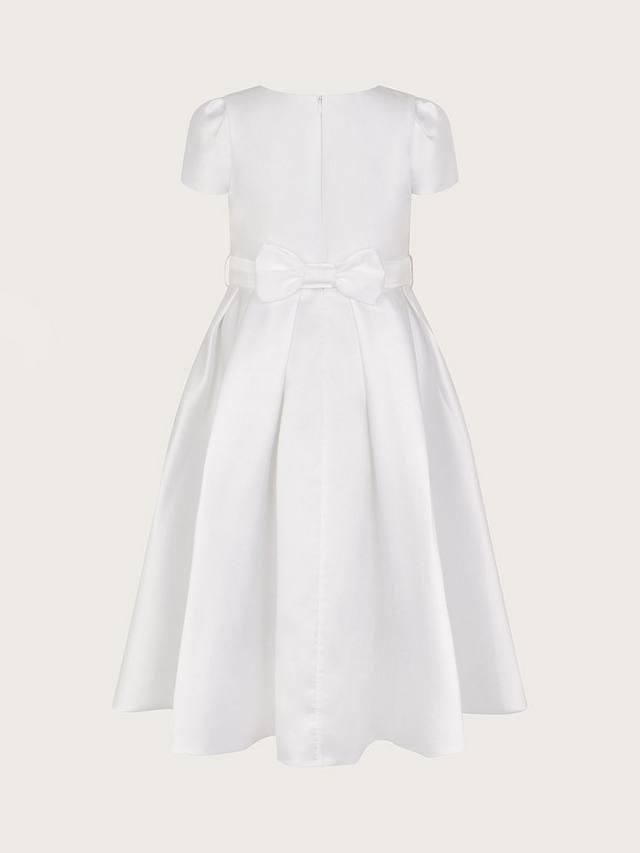 Это платье идеально подходит для свадебных церемоний, первого причастия или любого другого особого случая. Оно имеет короткие рукава, лиф, расшитый жемчугом, пояс с бантом на талии и элегантную юбку А-силуэта. Застегивается на молнию сзади.