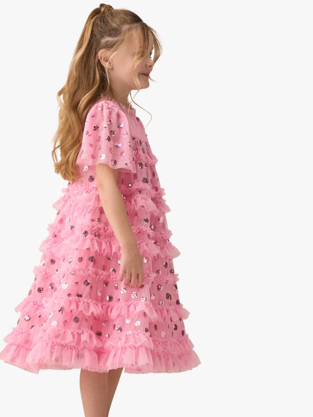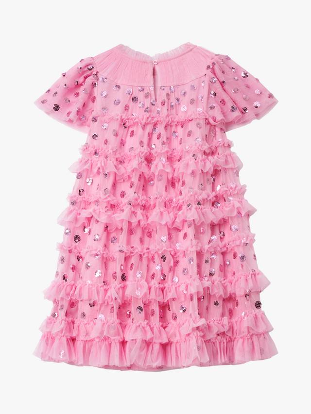 Внимание, фотовспышки! Приготовьтесь ослепить всех в этом очаровательном розовом платье удлиненного силуэта с пышной юбкой, полной объемов и многослойной отделки. Усыпанное мерцающими пайетками, оно идеально подходит для того, чтобы кружиться всю ночь напролет.