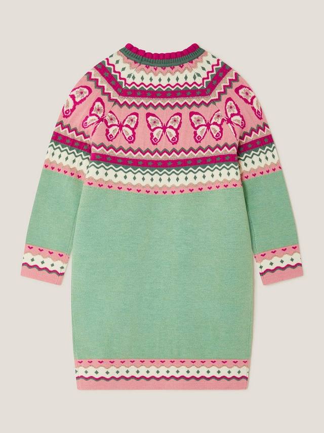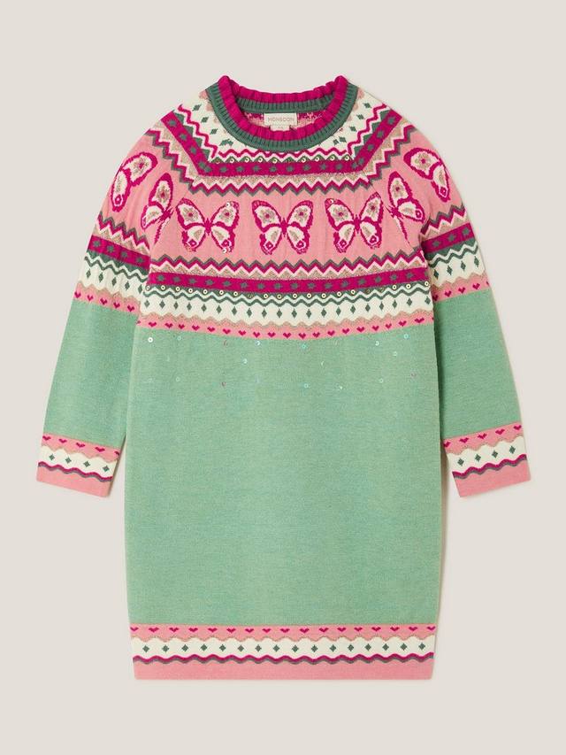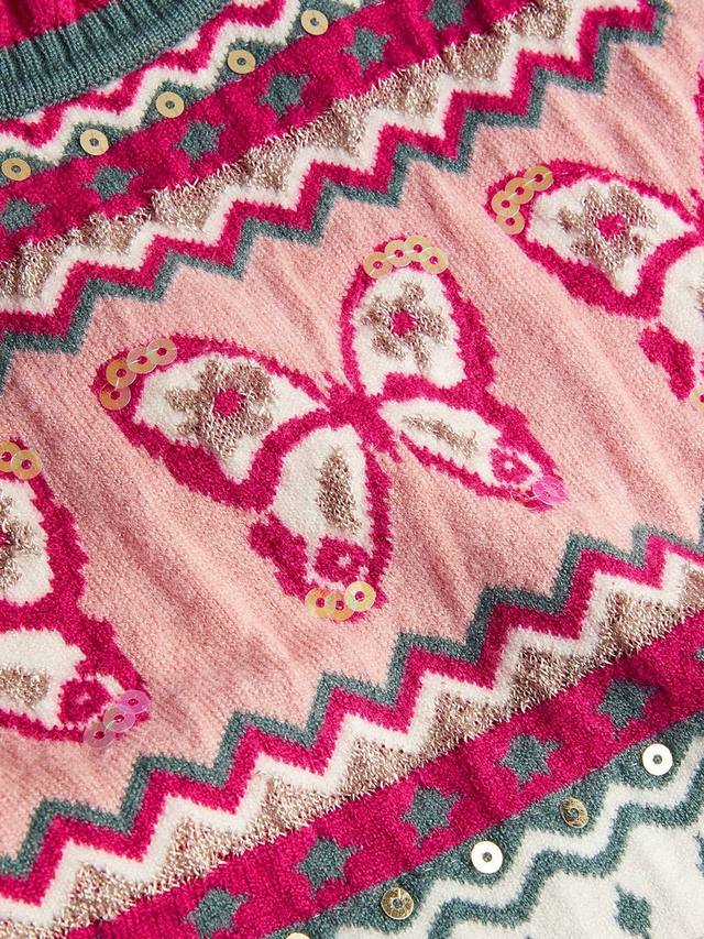Это платье-джемпер с узором фэр-айл в виде бабочки и мелкими блестящими пайетками станет идеальным выбором для предстоящих холодных месяцев. Дополните образ шерстяными колготками и ботинками-стопами.