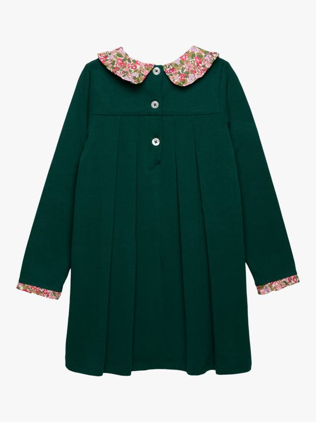 Это платье А-силуэта насыщенного лесного зеленого цвета с длинными рукавами и классической складкой спереди. Оно украшено эффектным воротником-хрустящей корочкой и манжетами из ткани с принтом Hedgerow Ramble от Liberty, на котором изображены ежевика и густые цветы ярких синих, зеленых и желтых оттенков, а также небольшим бархатным бантом на груди. Оно станет идеальной базой гардероба с изюминкой.