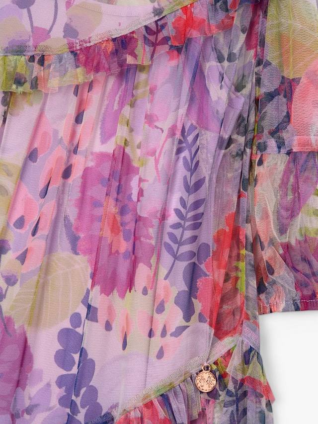 Это сетчатое платье, которое легко надеть как на выход, так и на работу, выделяется своим объемным красочным цветочным принтом и струящимся силуэтом. Мягкие каскадные оборки доходят до колена, а застежка на пуговицы сзади на горловине.