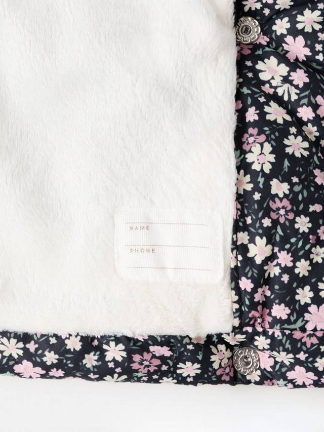 Это уютное стеганое пальто, украшенное очаровательным цветочным принтом, имеет высокий воротник для дополнительного тепла, боковые карманы, а также застежки на молнии и кнопках для безопасности малышей.