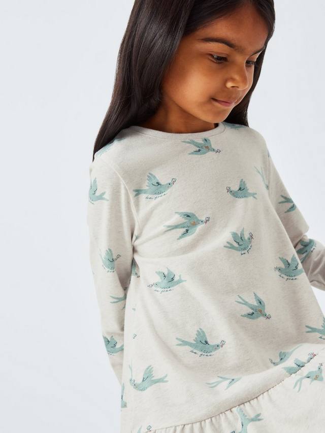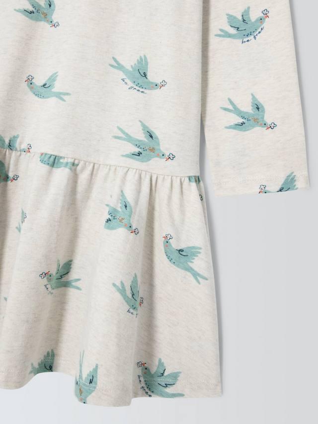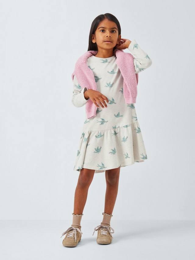 Это платье изготовлено из эластичной хлопковой смеси, с красочным принтом в виде птиц по всей поверхности и забавной оборкой.