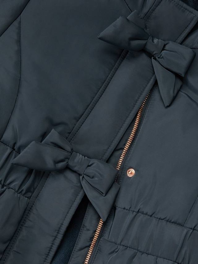 Это пальто идеально подходит для того, чтобы согреться во время поездки в школу. Оно имеет пушистый капюшон, утепленную отделку и два банта спереди.