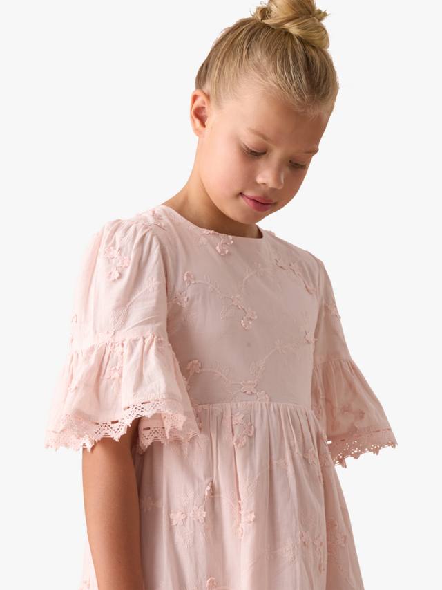 Изготовлено из красивой вышитой розовой ткани с вырезом на спине. Отличительной чертой этого платья, достойного кружения, являются ниспадающие многоярусные рукава с красивой кружевной отделкой.