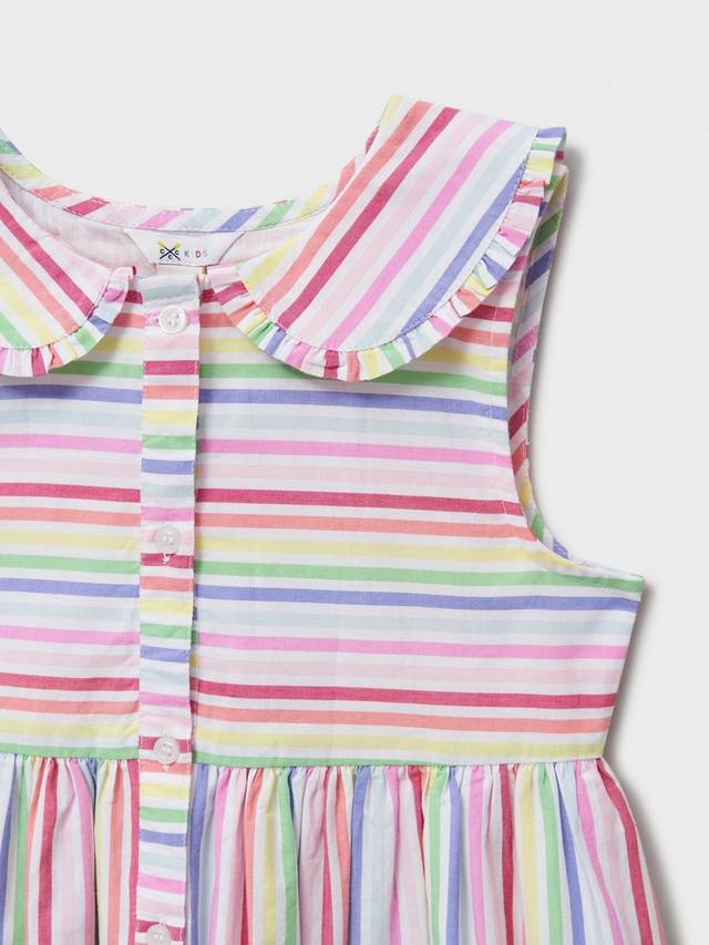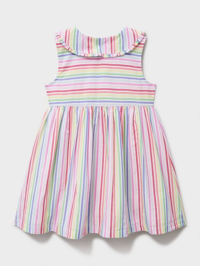 Хлопковое платье без рукавов в разноцветную полоску. Комфортное для малышей, оно сшито из лёгкой, дышащей ткани, идеально подходящей для солнечных дней. Воротник Питер Пэн, отделанный оборками, фирменные пуговицы спереди и слегка расклешённая юбка создают очаровательное сочетание классики и современности.
