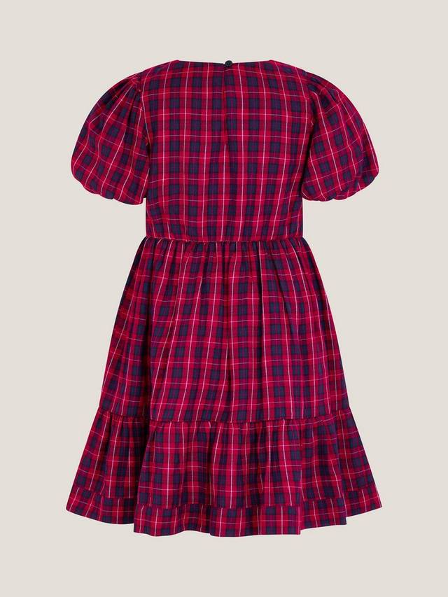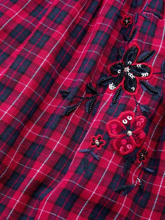 Это платье в красно-тёмно-синей клетчатой ткани с рукавами-фонариками для создания лёгкого драматизма украшено цветочным принтом из пайеток. Застёжка на пуговицы сзади на вырезе.