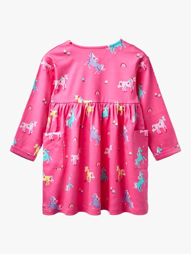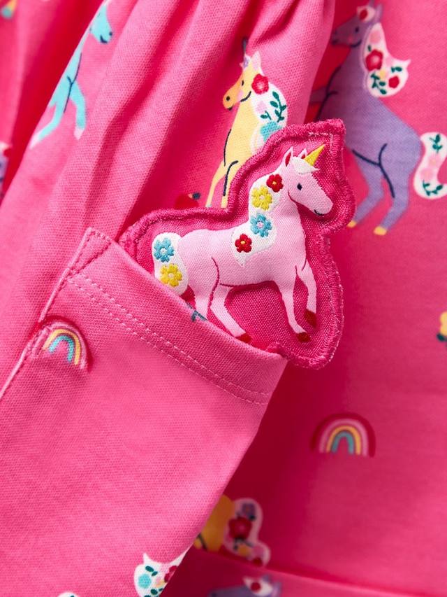 Это мягкое хлопковое платье привлекает внимание очаровательным принтом в виде единорога и игрушечным питомцем, которые добавляют немного сказочного волшебства. Платье имеет круглый вырез горловины и застегивается на пуговицы спереди.