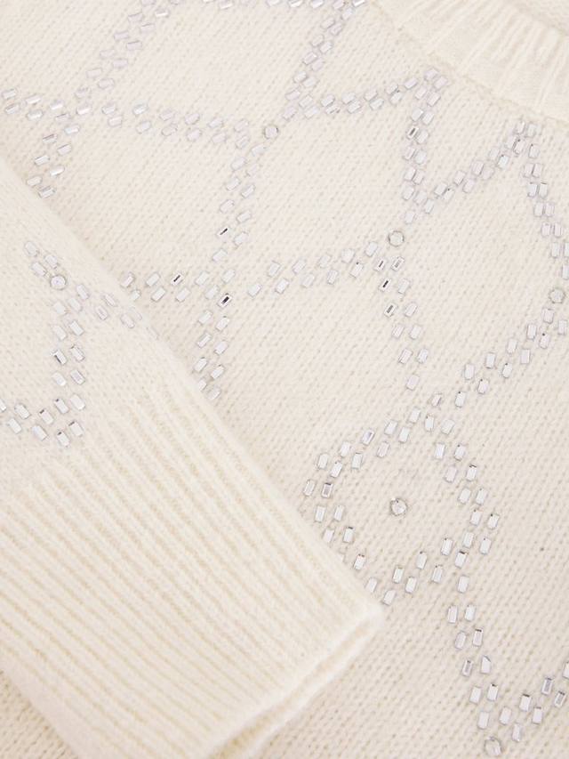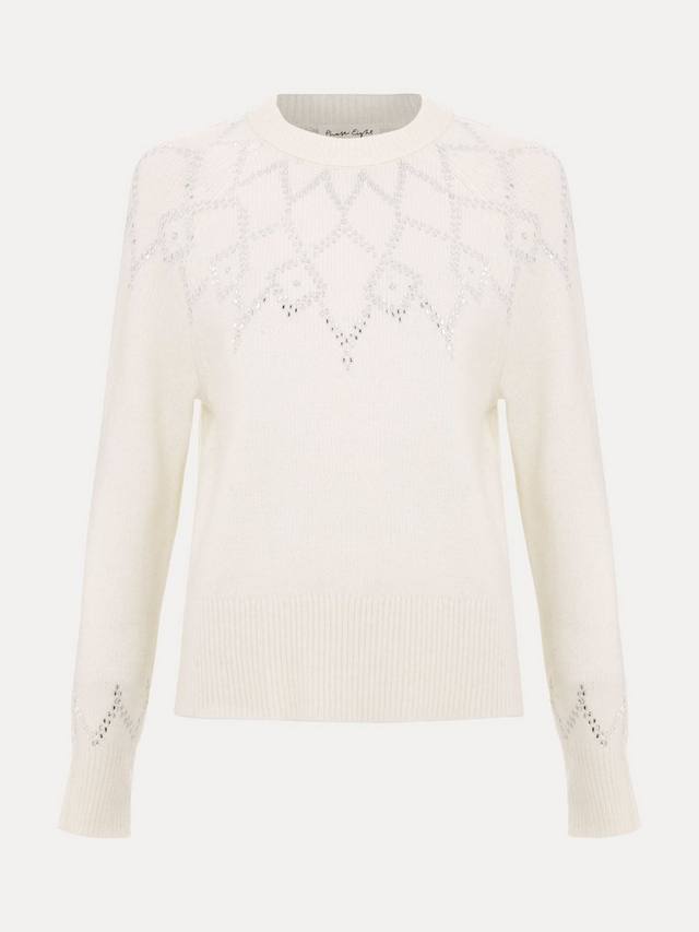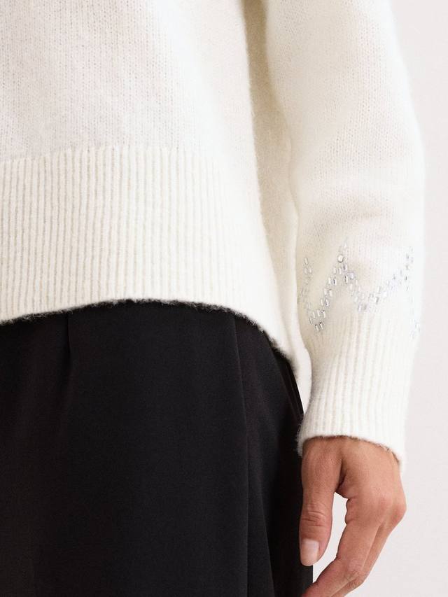Этот мягкий трикотажный джемпер ручной вязки украшен изящной отделкой из пайеток на лифе и манжетах, что добавит женственности вашему повседневному зимнему образу. Сочетайте его с джинсами для создания непринужденного дневного образа, а с юбками или платьями – для легкого вечернего образа.
