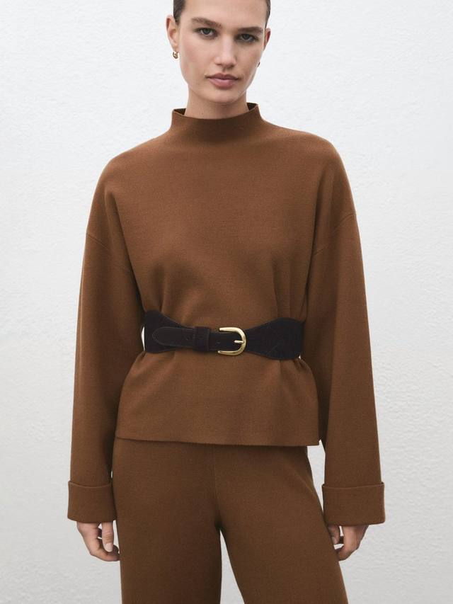 Простой повседневный фасон с высоким вырезом и объемными рукавами.