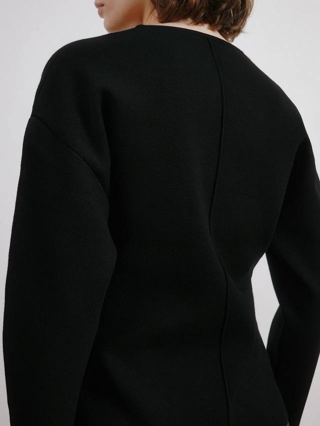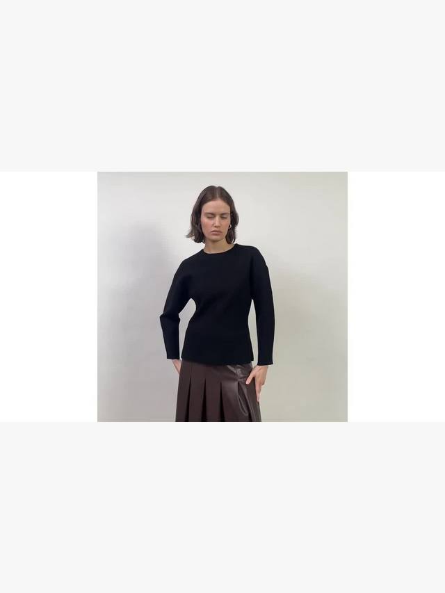 Плотный трикотажный джемпер облегающего силуэта. Аккуратный круглый вырез горловины и слегка закругленные рукава.