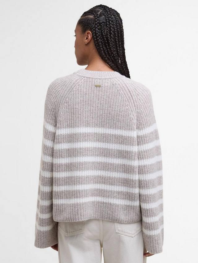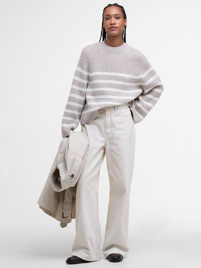 Универсальный джемпер Barbour Irene в полоску, сочетающийся с другими слоями, выполнен из ребристого трикотажа в стиле рыбак, что создает современный образ. Этот простой базовый свитер из смесовой шерсти связан текстурированной вязкой по всей поверхности, а спущенные плечи и свободный крой придают ему непринужденный вид.