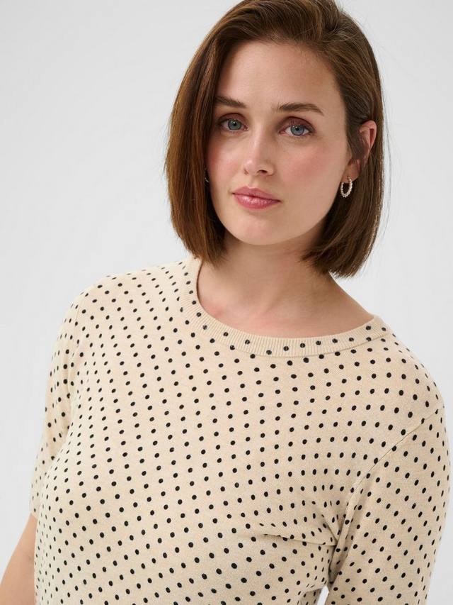 KAFFE переосмысливает повседневный комфорт с этим тонким трикотажным джемпером в горошек. Изготовленный из мягкой вискозной смеси, он с игривым рисунком добавит индивидуальности, а круглый вырез горловины и короткие рукава позволят легко комбинировать вещи.