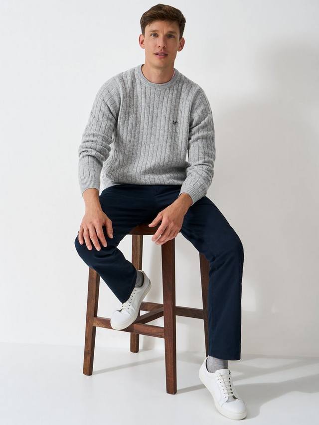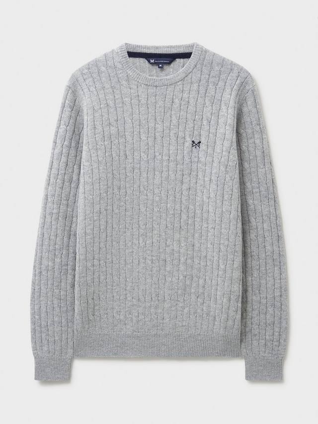 Мужской джемпер с косичной вязкой серого меланжевого цвета. Он сшит из невероятно мягкой и теплой овечьей шерсти для комфорта и превосходного ощущения. Вышитый логотип дополняет образ.