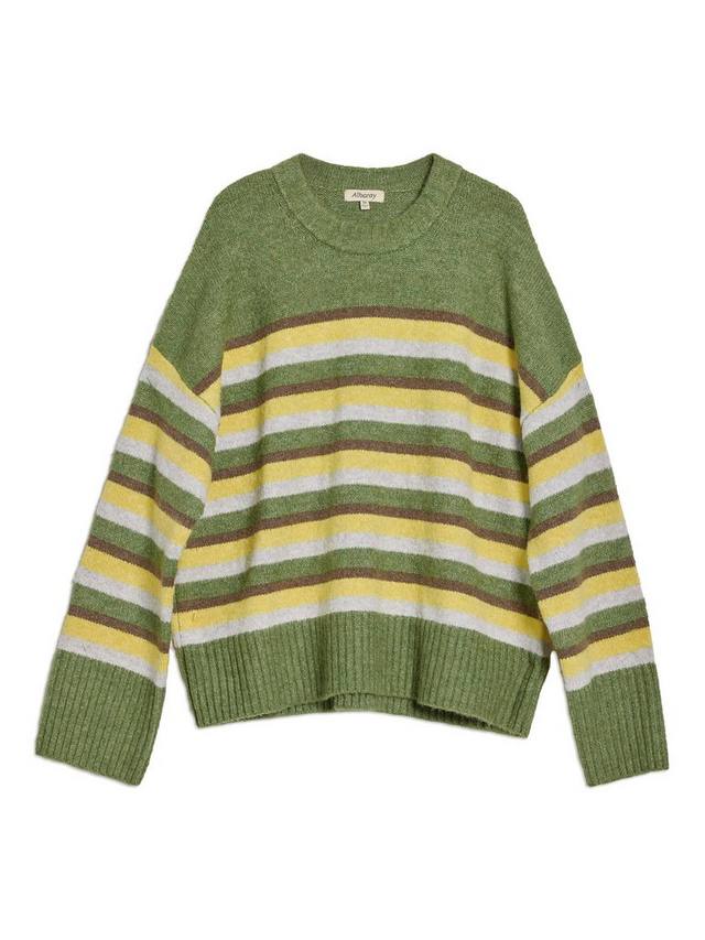 Этот супермягкий джемпер дополнен зелеными, шоколадными и лимонными полосками, которые являются ключевыми оттенками в палитре этого сезона.