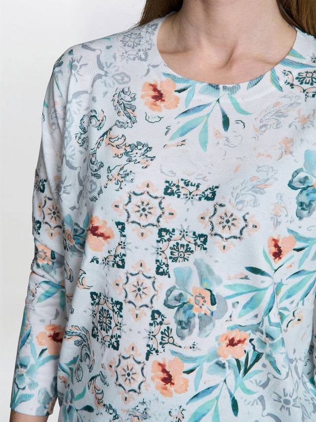 Великолепный джемпер с узором пейсли и отделкой серебристыми стразами. Этот свитер имеет изящный V-образный вырез и рукава 3/4.