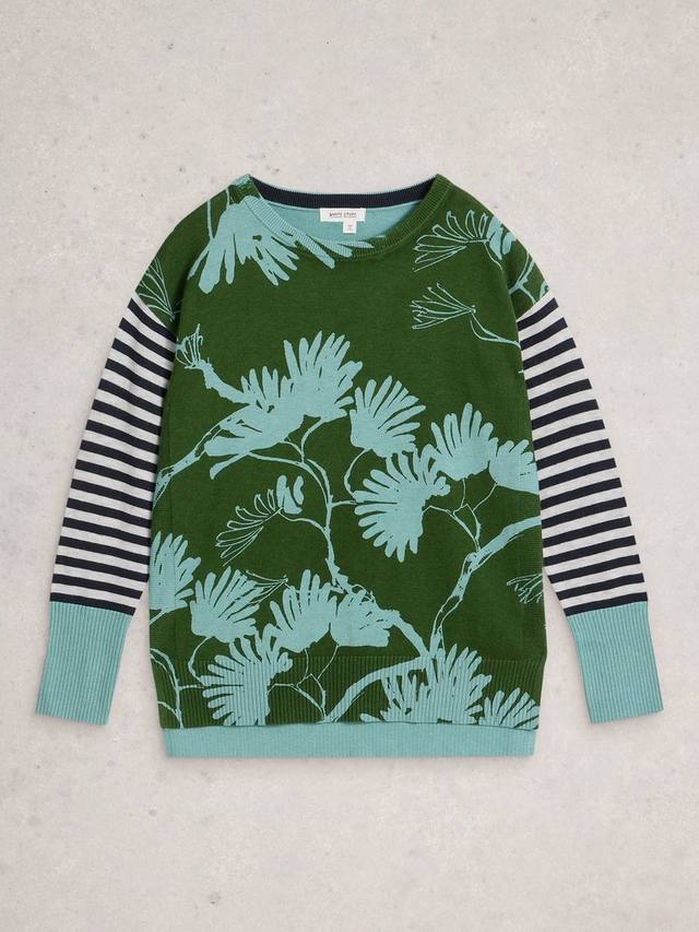 Тонкий трикотажный джемпер с яркими полосками и нежными цветочными деталями, сочетающий в себе мягкость и игривость. Дышащая хлопковая ткань обеспечит вам комфорт и стиль как на работе, так и в выходные.