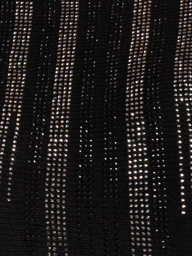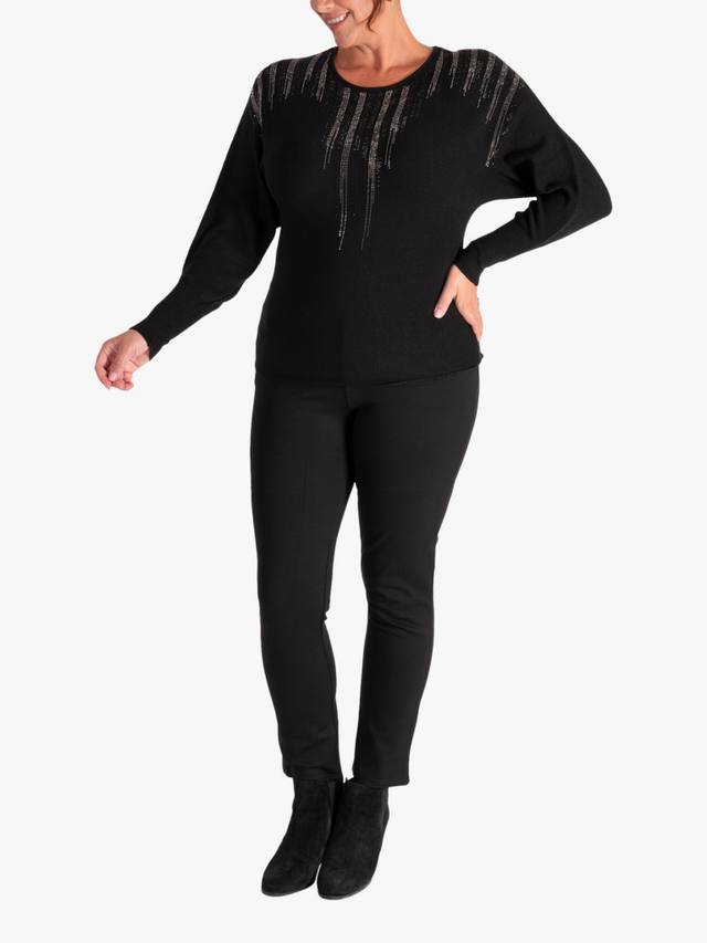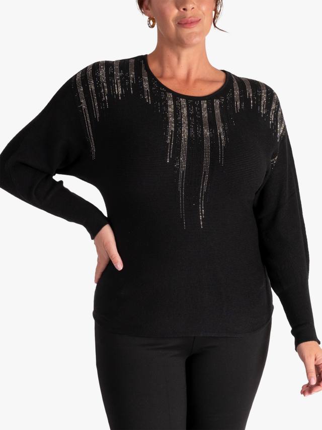 Этот простой, но элегантный джемпер из тонкой вязки в рубчик с круглым вырезом украшен отделкой из страз на переднем вырезе и ниспадает каскадом по спущенным плечам рукавов, создавая притягивающий взгляд блеск. Изготовлен из супермягкого трикотажа для комфорта, носите его с брюками или юбкой для ослепительного образа.
