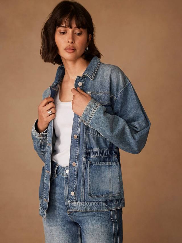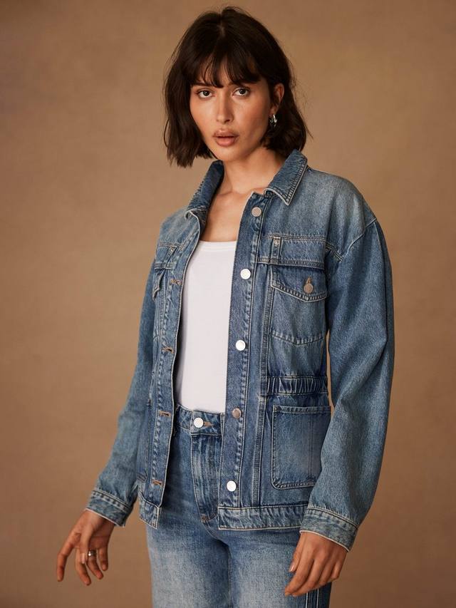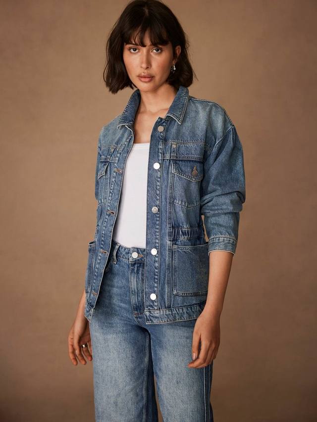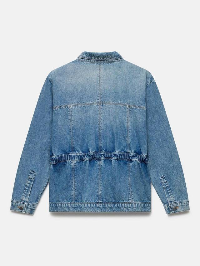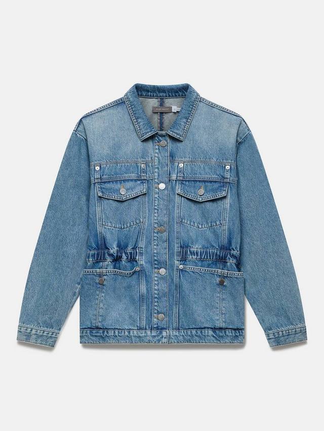 Эта джинсовая куртка сшита из мягкого денима цвета индиго и дополнена эластичным поясом. У нее классический воротник, четыре кармана, длинные рукава, манжеты на пуговицах и застежка на пуговицы спереди.