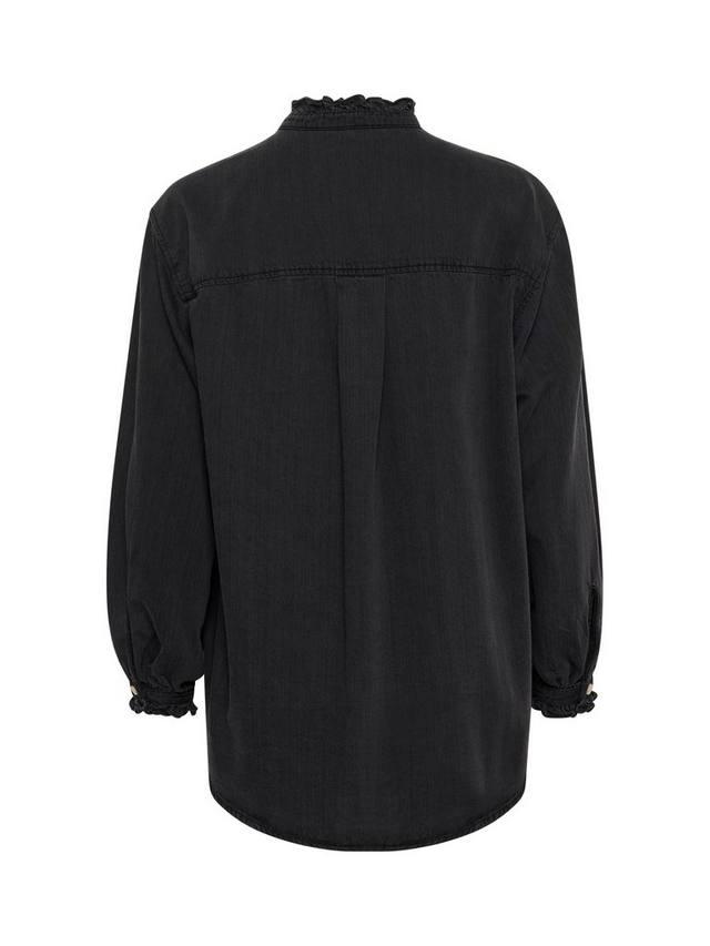 Джинсовая рубашка Ferah — это непринужденный и женственный повседневный стиль. Она имеет воротник-стойку с оборкой и застежку на пуговицы, а также свободный крой. Длинные свободные рукава с эластичной оборкой по краю. Рубашка имеет крой ниже бедер и закругленный подол.