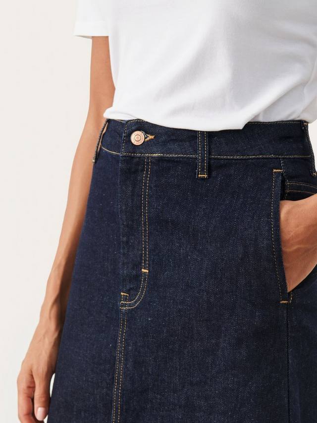 Юбка из денима Frigge — это повседневный вариант, который можно носить с любым верхом. Юбка имеет высокую талию, стандартный пояс и застежку на молнию и пуговицы. Юбка длиной ниже колен, А-образный крой и разрез сзади.