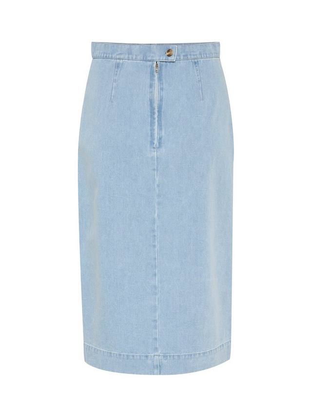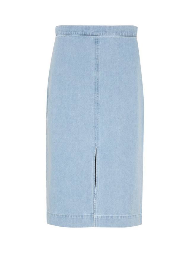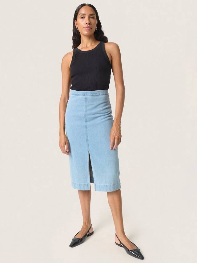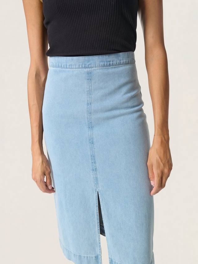 Джинсовая юбка Annabeth — простая и универсальная модель, которая отлично сочетается с любым верхом. Высокая талия, застежка на молнию и пуговицу сзади, облегающий силуэт и крой. Юбка длиной ниже колен, с высоким разрезом спереди.
