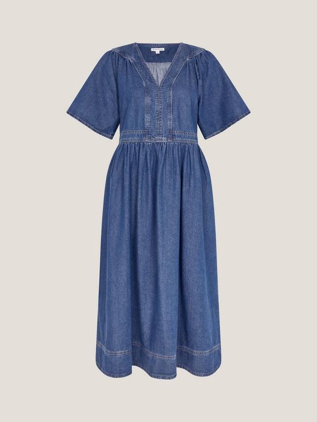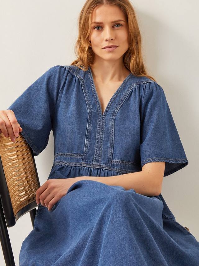 Мы любим классику. Это платье из синего денима с V-образным вырезом, короткими рукавами и струящимся подолом миди. Универсальный выбор, который можно носить с ботинками, лоферами или сандалиями в любое время года.