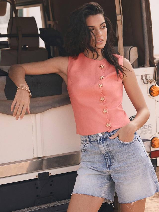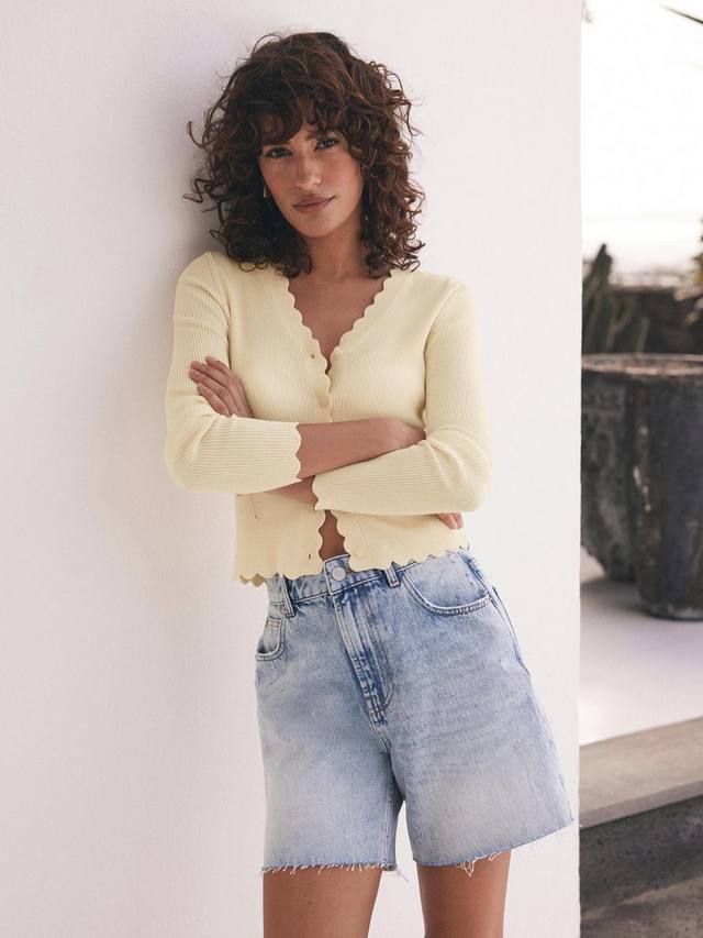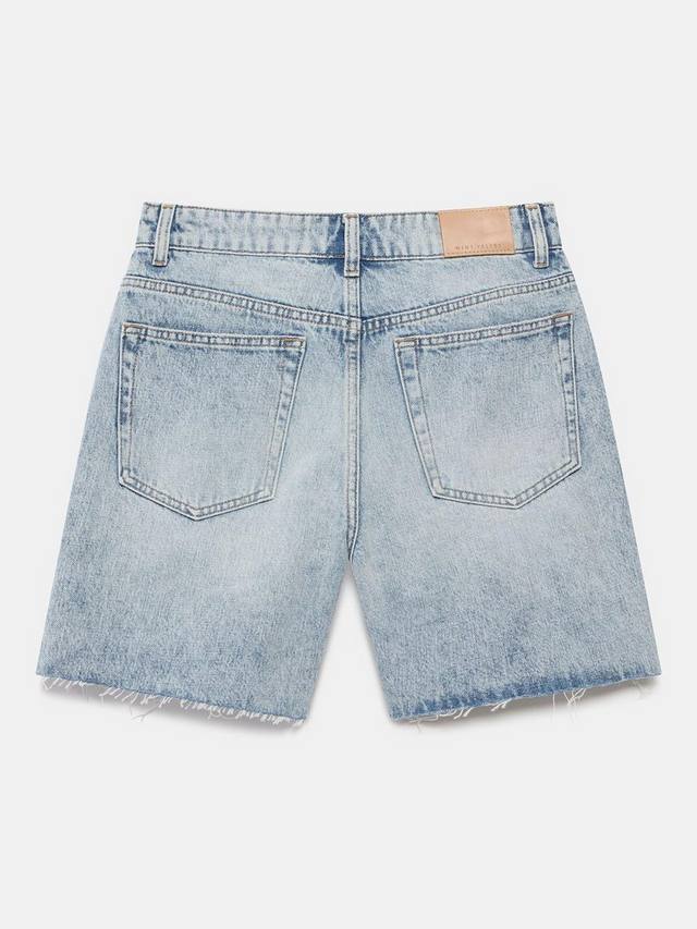 Пара джинсовых шорт из чистого хлопка с высокой посадкой, шлевками для ремня, пятью карманами, необработанным подолом и застежкой на потайную молнию и пуговицы.
