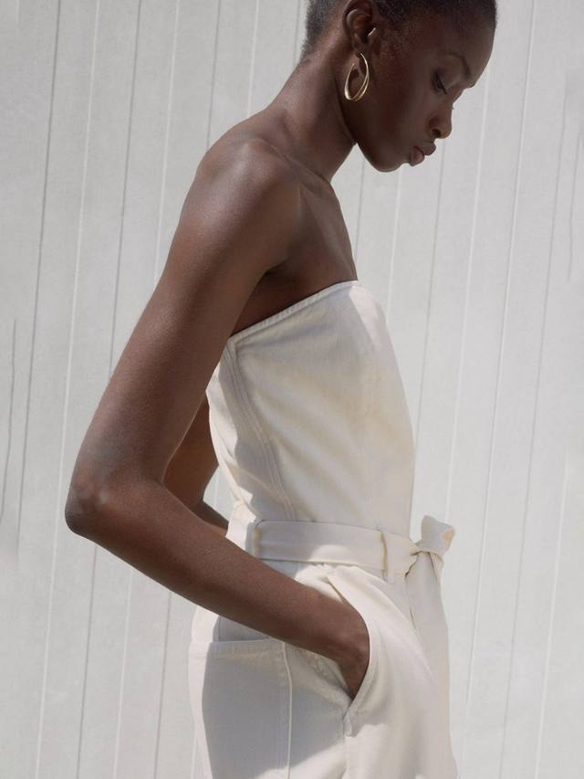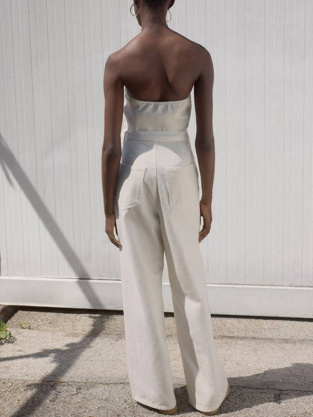 Этот комбинезон из хлопкового денима с вырезом бандо, прямыми брючинами и поясом на талии. Продуманный силуэт обеспечивает комфорт и уверенный вид, идеально подходит как для дневных, так и для вечерних образов. Застежка-молния.