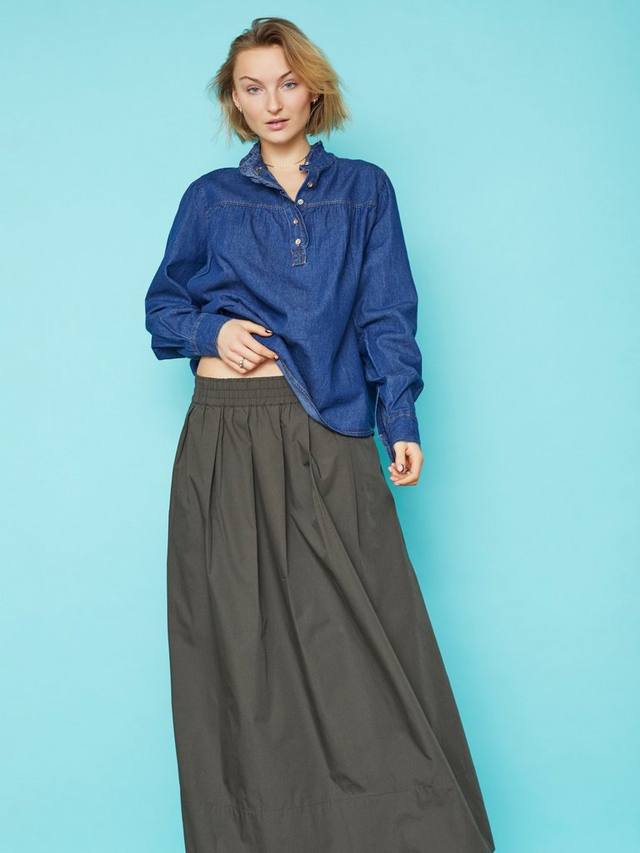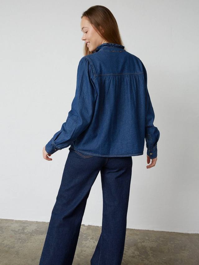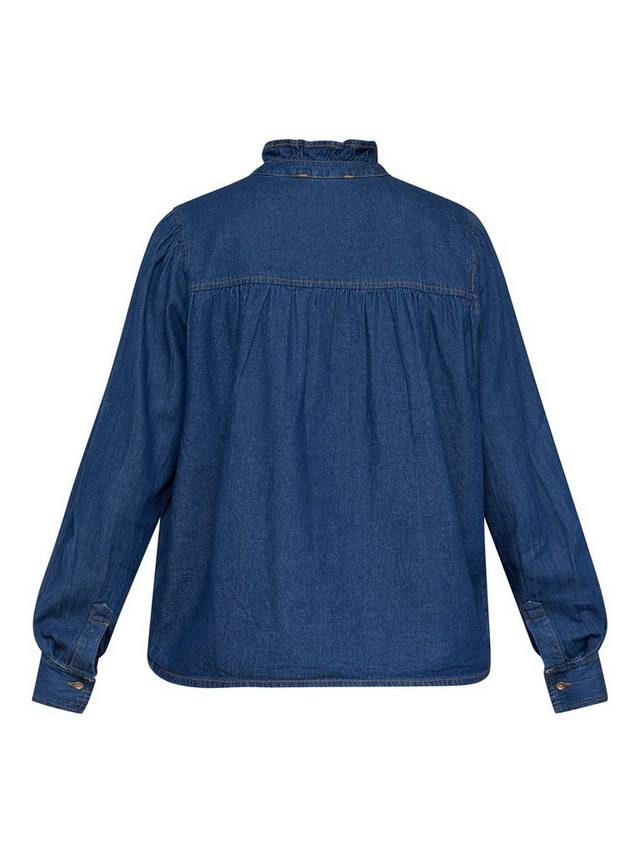 Ubisa — женская джинсовая рубашка с высоким воротником. У рубашки длинные рукава и короткая застёжка на пуговицы на горловине.