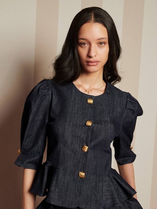 Топ с баской из структурированной джинсовой ткани. Украшен оборкой и короткими рукавами со складками. Застёгивается на эффектные золотые пуговицы.