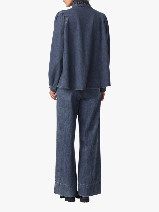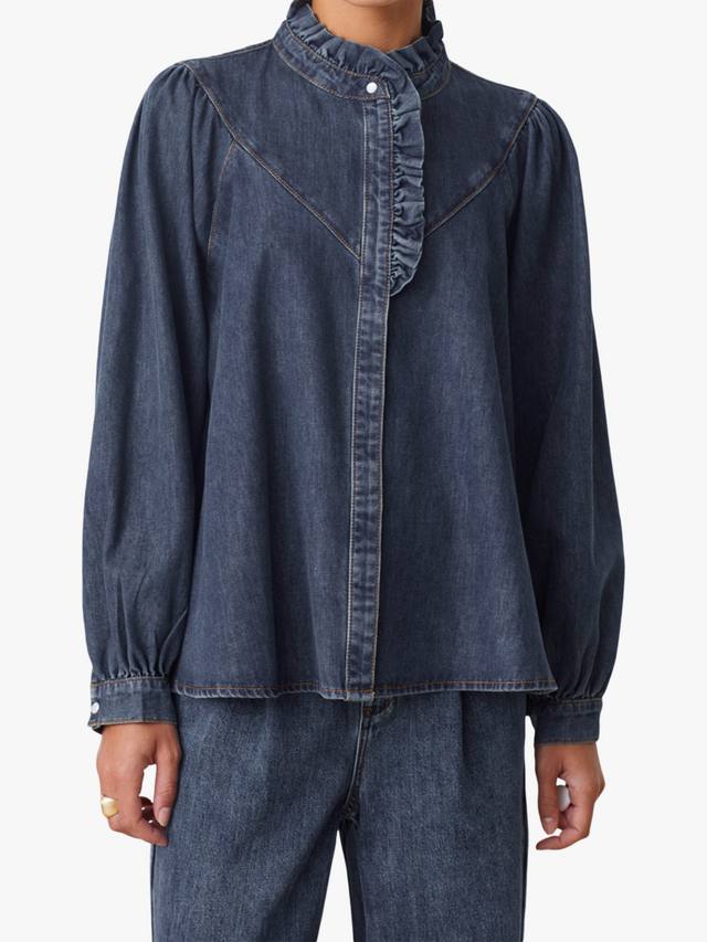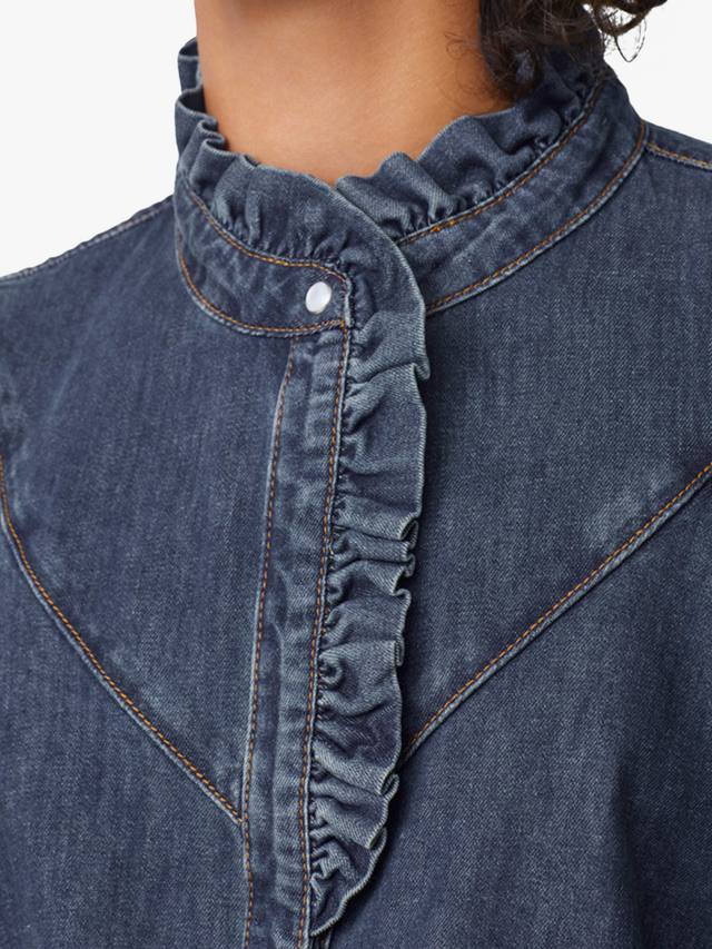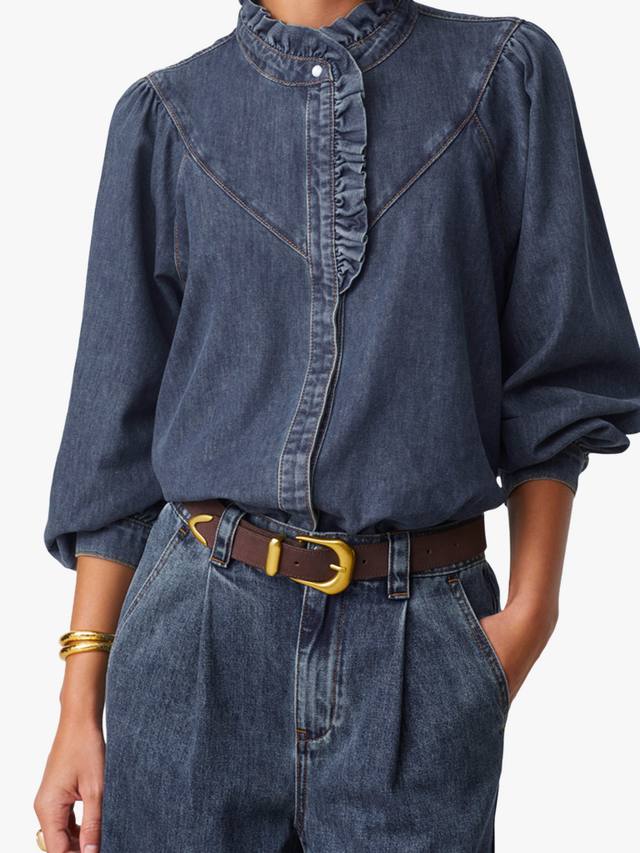 Эта джинсовая рубашка с рюшами от SUNCOO поднимет ваш повседневный образ на новый уровень, обеспечивая комфорт в повседневной жизни благодаря высокому вырезу, длинным рукавам и классическому крою.