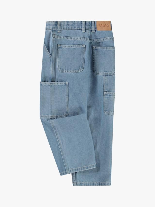Джинсы из смесовой хлопковой ткани в стиле рабочей одежды. У джинсов есть шлёвки для ремня, боковые и задние карманы, а также детали, характерные для рабочей одежды. Свободный крой и эластичный пояс позволяют регулировать их размер, что позволяет носить джинсы большинству детей. Это также означает, что ребёнок сможет носить их дольше.