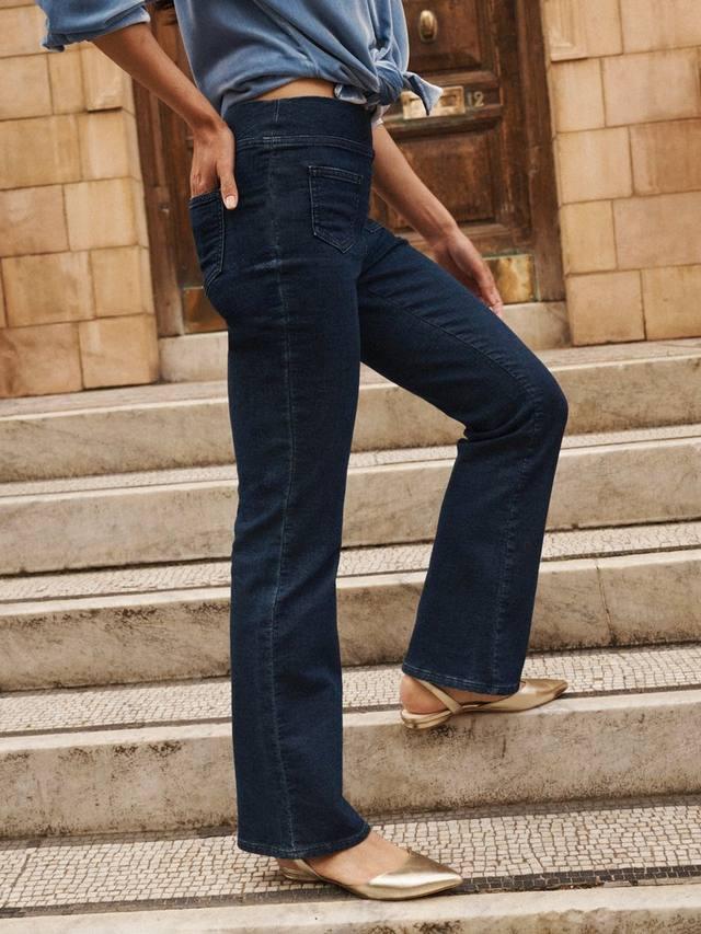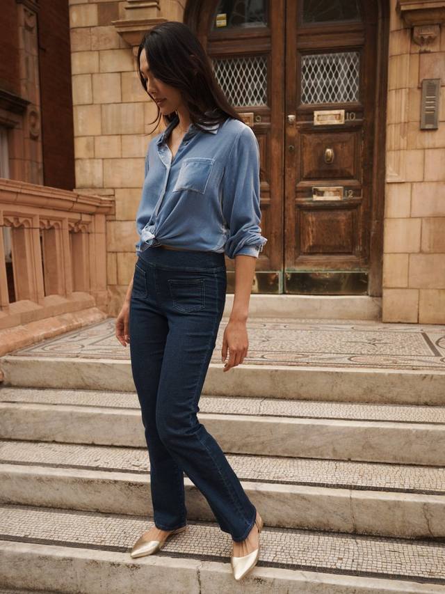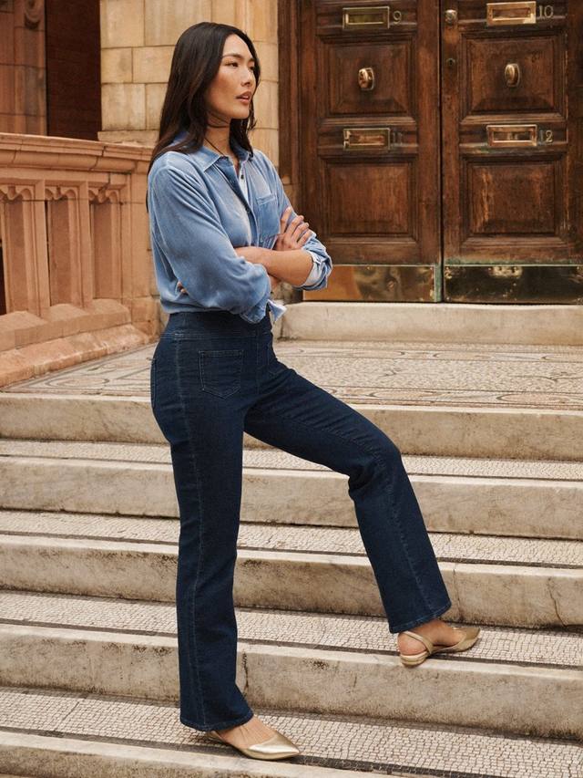 Ava — джинсы-клеш из эластичного джинсового трикотажа. Идеально подходят для расслабленных выходных или прогулок по городу. Дополните их футболкой и кашемировым джемпером или добавьте нотку изысканности с помощью бархатной рубашки.