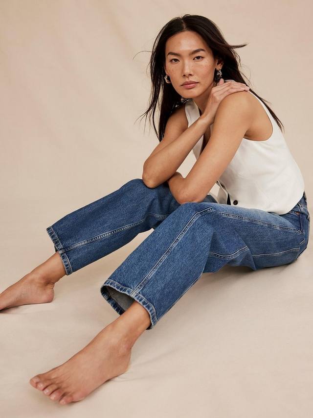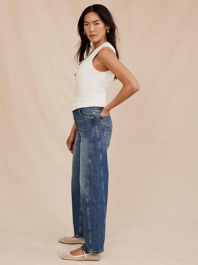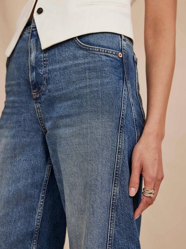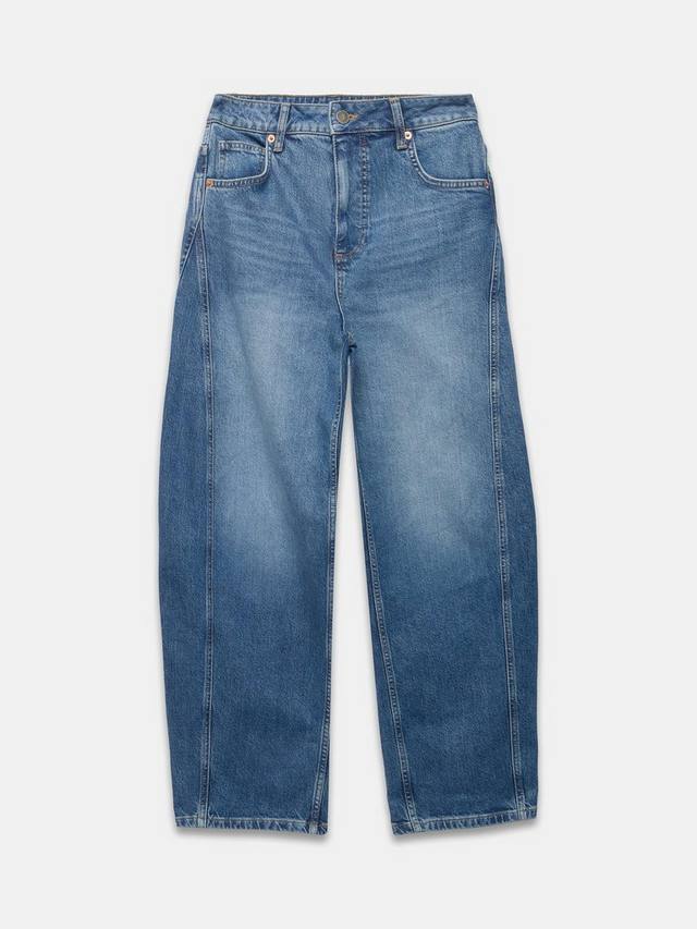 Джинсы цвета индиго с высокой посадкой, шлевками для ремня, пятью карманами, бочкообразными штанинами, зауженным нижним краем по всей длине с потайной застежкой на молнию и пуговицы.