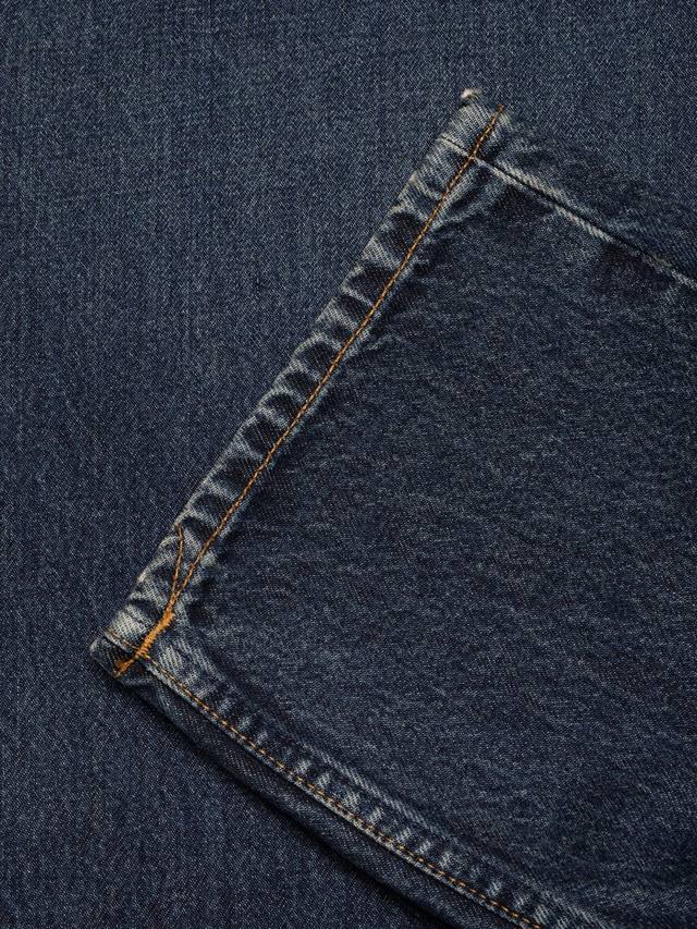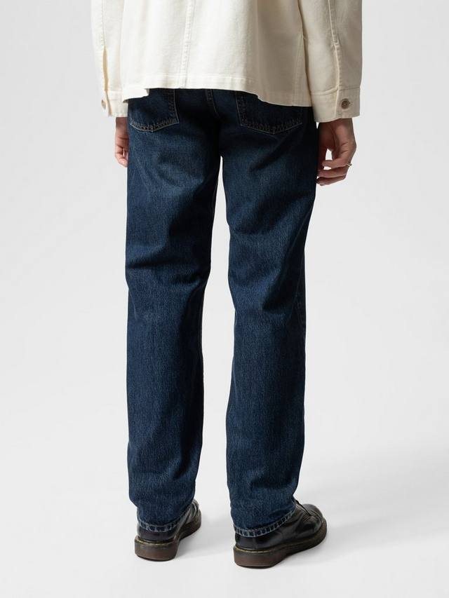 Эти джинсы классического кроя от Nudie Jeans, изготовленные из органического хлопка и жесткого денима плотностью 14,9 унций, украшены табачной нитью по швам, темно-синей вышивкой на заднем кармане, медной отделкой, гульфиком на пуговицах и нашивкой из жакрона.