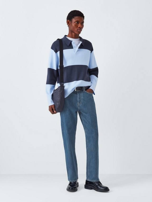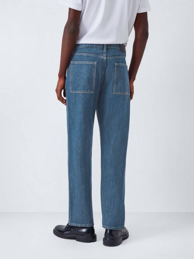 Джинсы из денима классического прямого кроя с пятью карманами: два передних кармана, два сзади и карман для монет. Дополнен шлевками для ремня на поясе и застежкой на одну пуговицу и молнию.