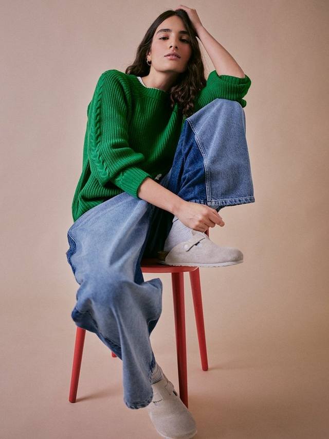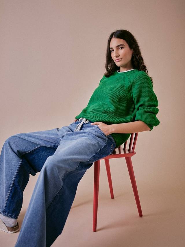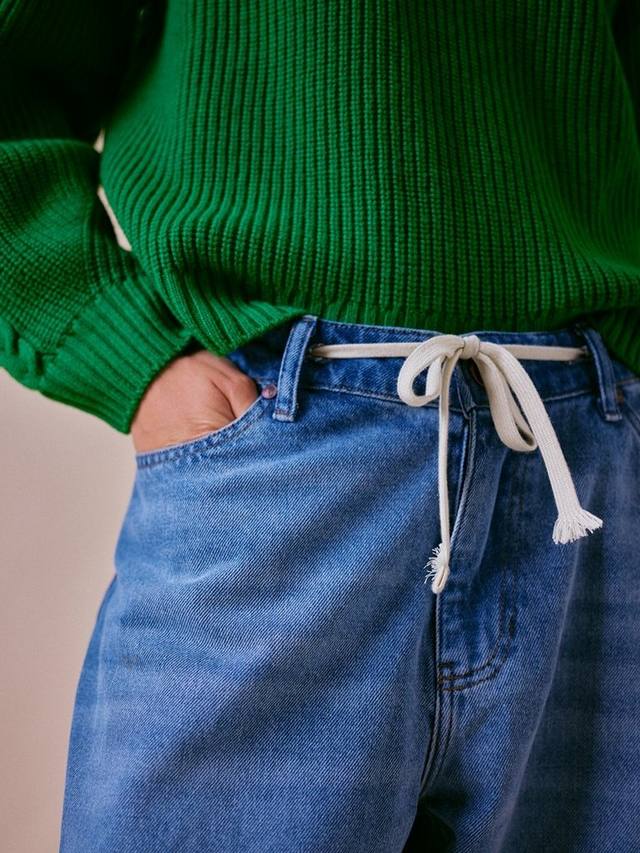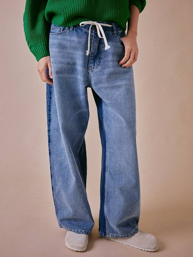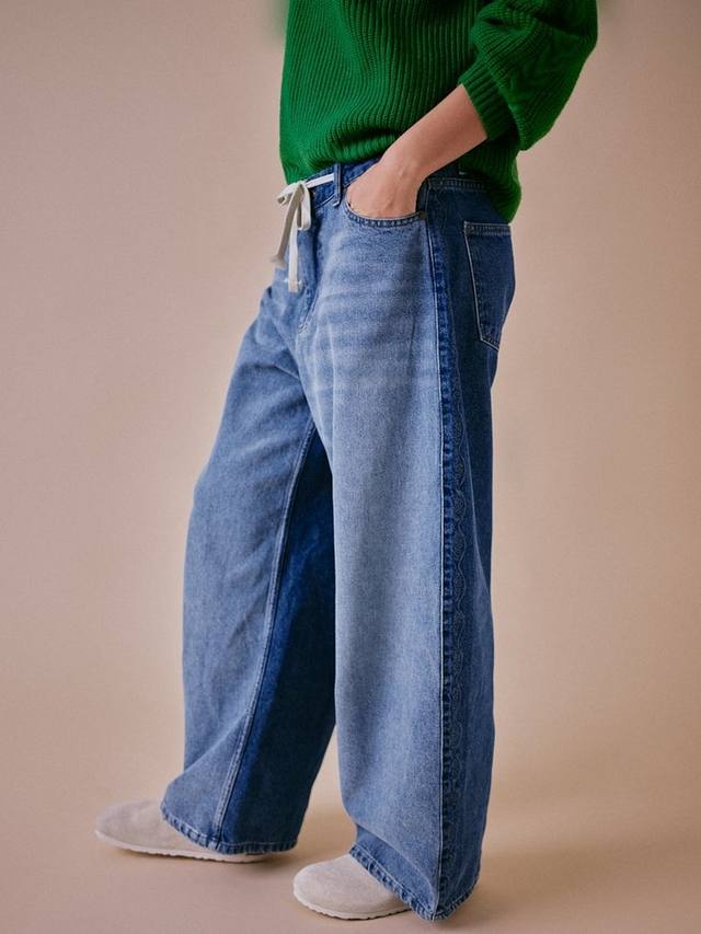 Изготовлено из смеси двух оттенков денима. Боковые вышитые волны символизируют ритм прилива. Множество карманов и свободный крой брючины. Отличный вариант на любой сезон.