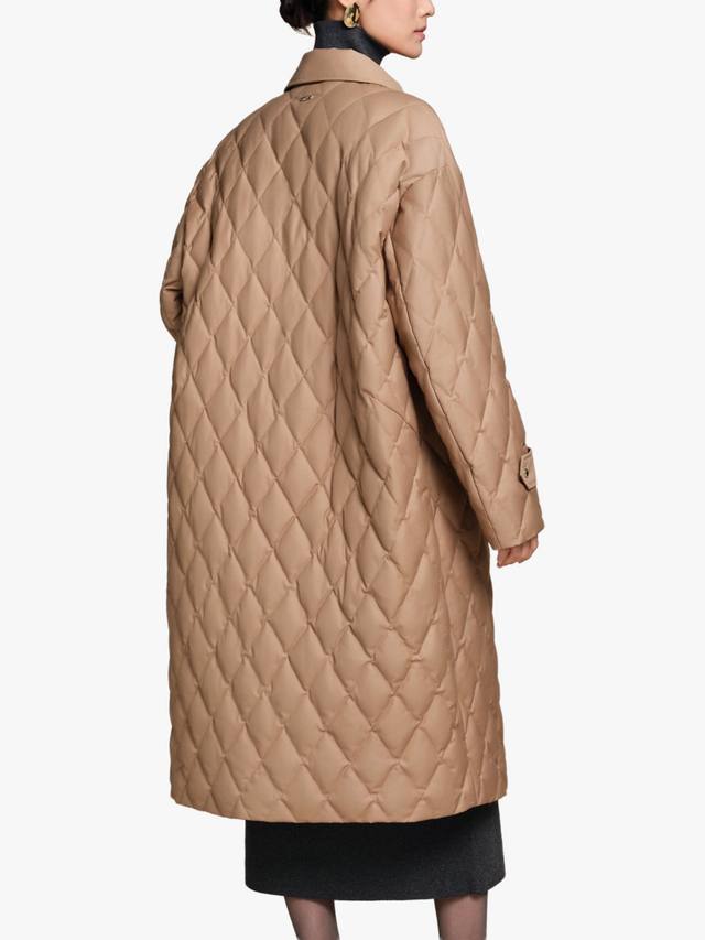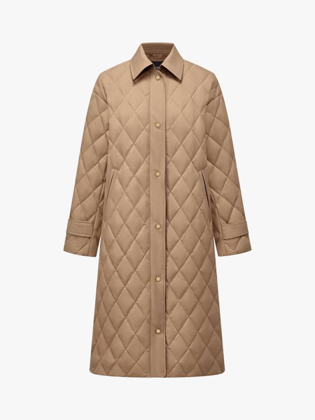 Оставайтесь в тепле и элегантности в этой длинной куртке из шелковистой стеганой ткани с наполнителем из более чем 700% гусиного пуха. Благодаря рубашечному воротнику и лаконичному, подчеркивающему фигуру силуэту, она идеально подходит для зимних прогулок или вечерних выходов. Продуманные детали, такие как изготовленные на заказ пуговицы, дополняют классический дизайн.