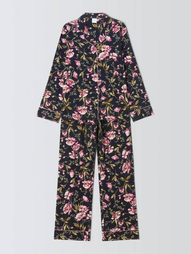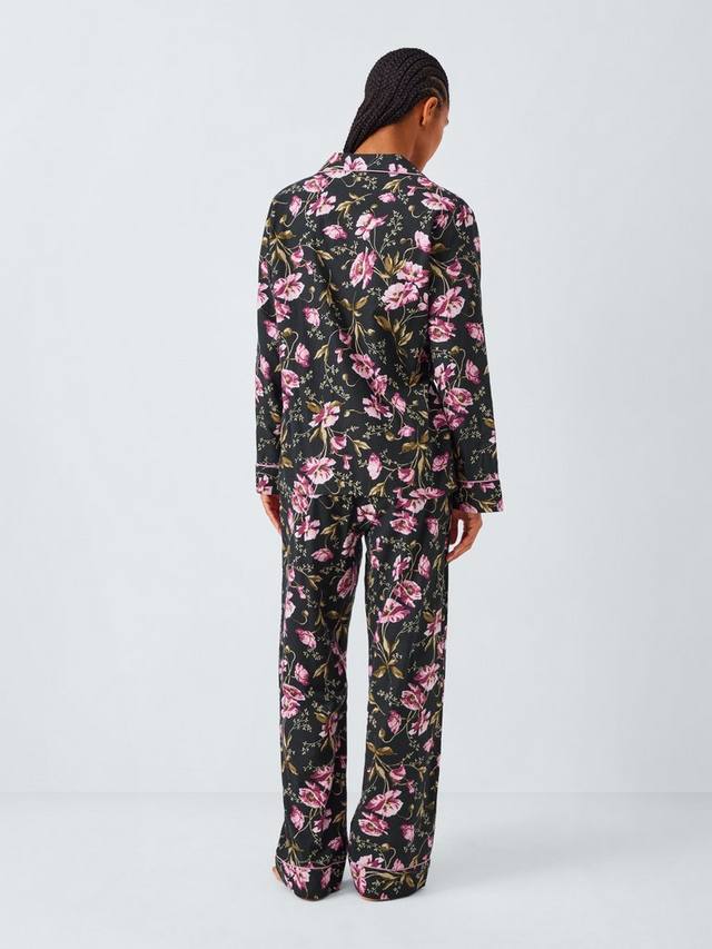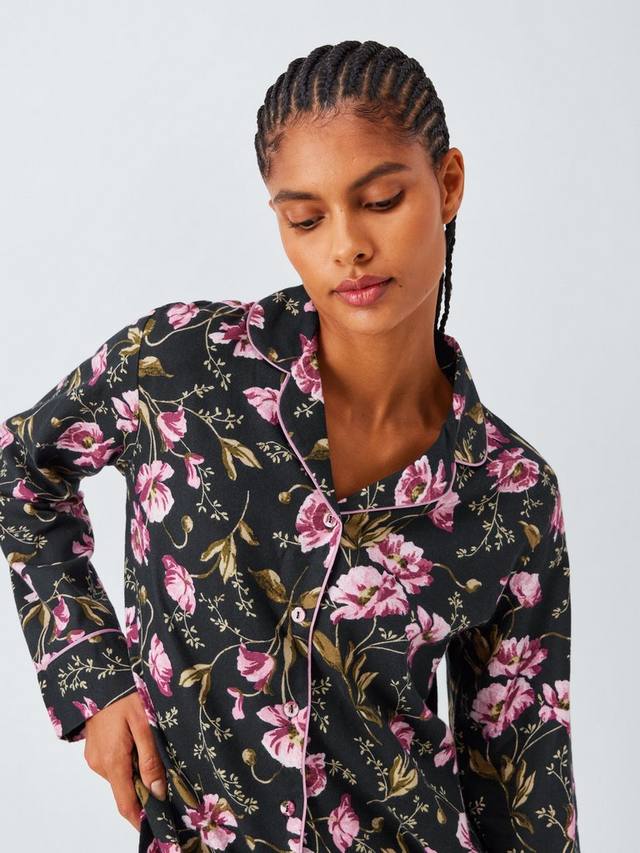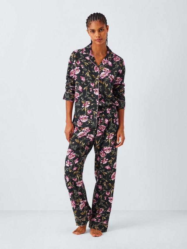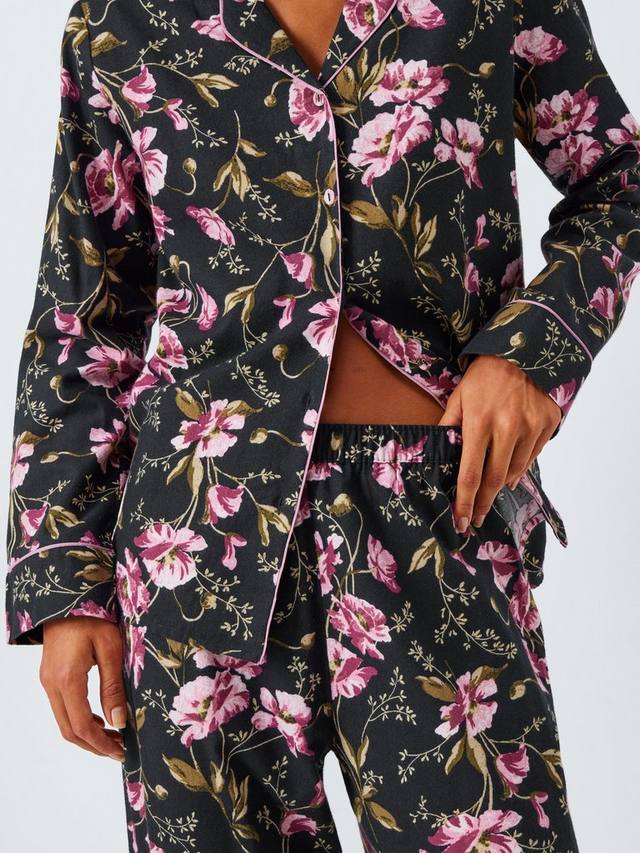 Пижамный комплект из чистого хлопка с красивым струящимся цветочным рисунком. Рубашка имеет отложной воротник и обтянутые тканью пуговицы, а пояс снизу полностью на резинке. Контрастная отделка по всему изделию добавляет очарования.