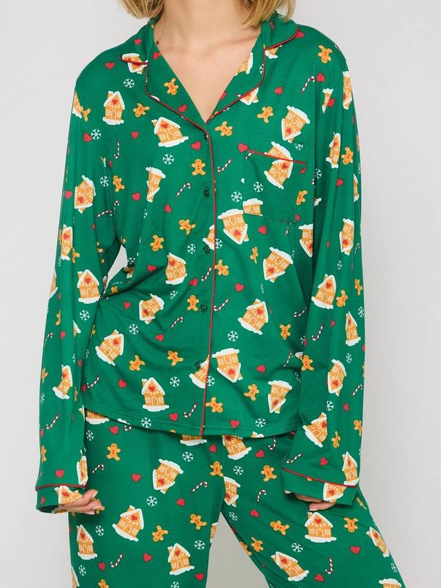Настройтесь на спокойный сон в пижамном комплекте Loungeable с принтом имбирные пряники, созданном для ежедневного комфорта, свободы движений и веселья. Спортивные брюки и рубашка с воротником-стойкой обеспечивают свободную посадку для отдыха или заслуженного сна.