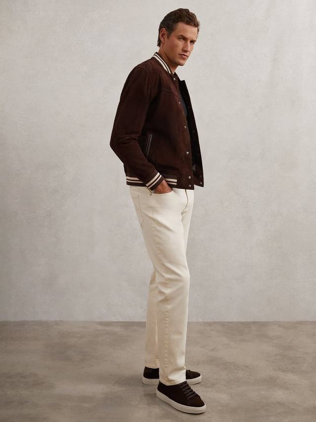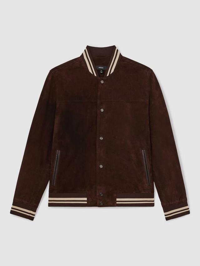 Эта замшевая куртка-бомбер сочетает в себе элегантный крой и уникальную текстуру, обеспечивая комфорт и броский вид. Благодаря эластичному полосатому воротнику и манжетам, она поможет вам легко выразить себя, где бы вы ни находились.