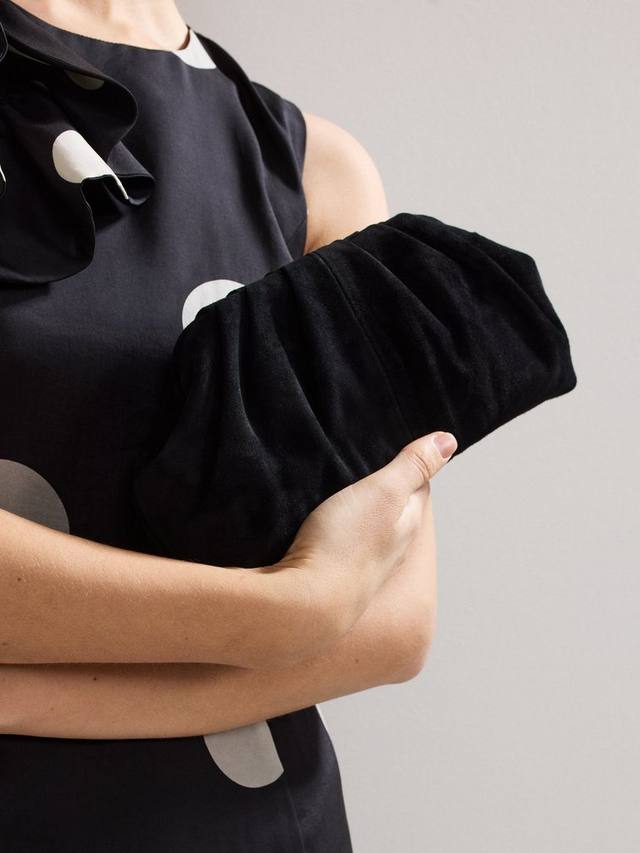 Эта замшевая сумочка-клатч с изящной плиссировкой, металлическими деталями и удобной цепочкой обеспечивает универсальность и идеально подходит в качестве изысканного аксессуара для мероприятий. Дополните образ подходящими замшевыми туфлями на каблуке.
