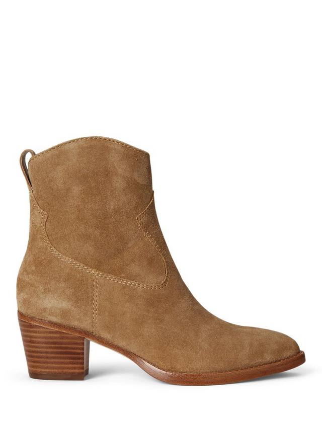 Ботинки Harpher от Lauren Ralph Lauren сшиты из мягкой замши с острыми носами, тональной строчкой и наборным каблуком — черты, которые вместе доказывают, что бренд полностью понимает эстетику, вдохновленную западным стилем.