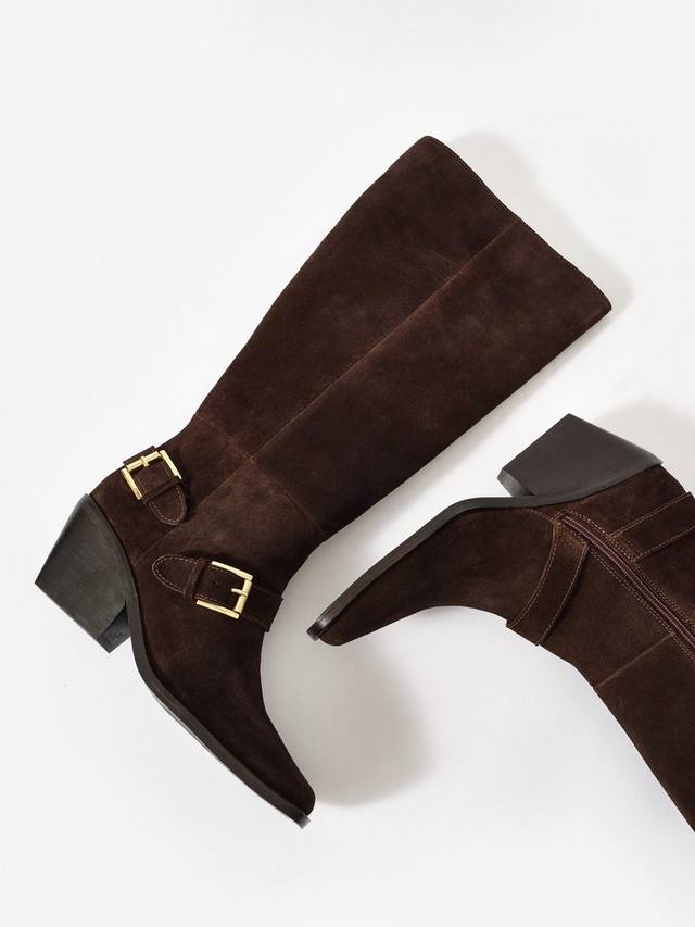 Замшевые сапоги до колена от Mint Velvet с квадратным носком. Каблук средней высоты в кубинском стиле добавляет подъема и обеспечивает комфорт, а застежка-молния позволяет легко надевать их для повседневных дел.