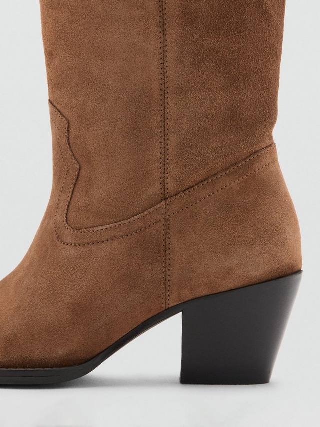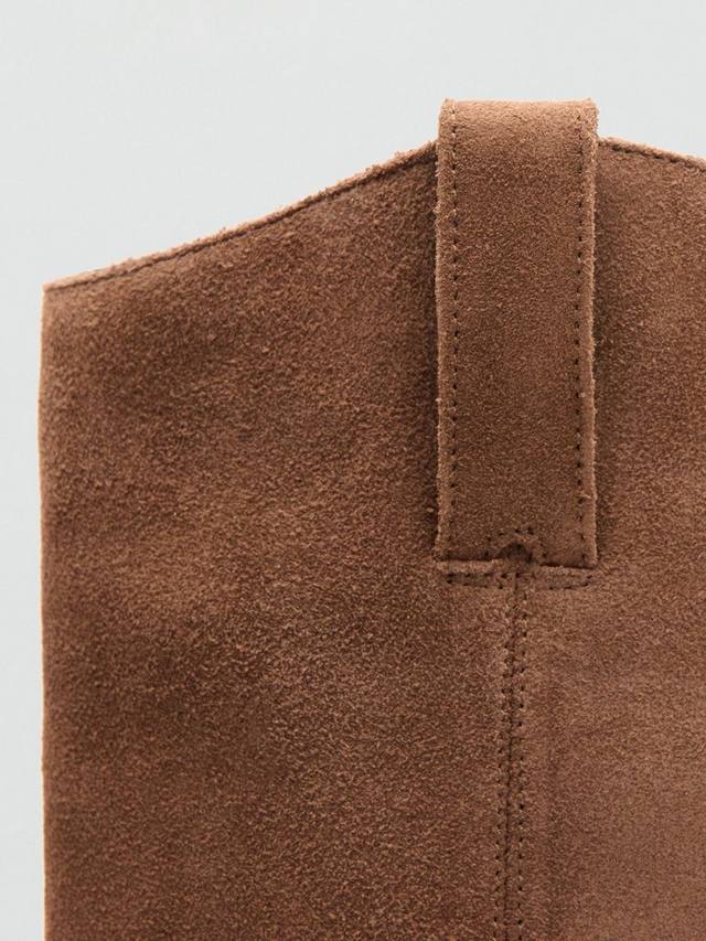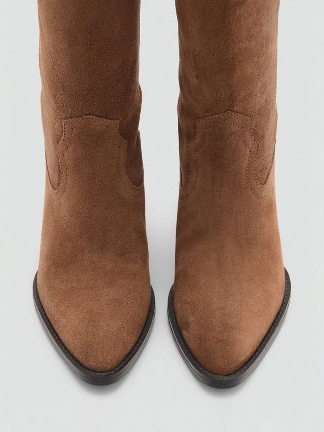 Замшевые ковбойские сапоги до колена. Каблук средней высоты обеспечивает комфорт и устойчивость, а заостренный закрытый носок привносит современный штрих в ваш образ. Идеально подходит для создания индивидуальности в повседневных нарядах.