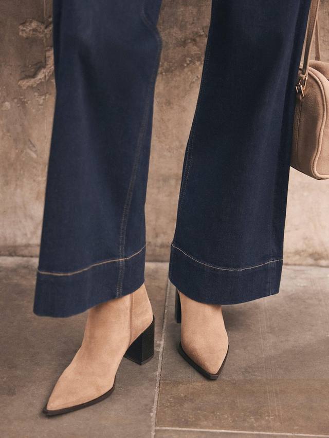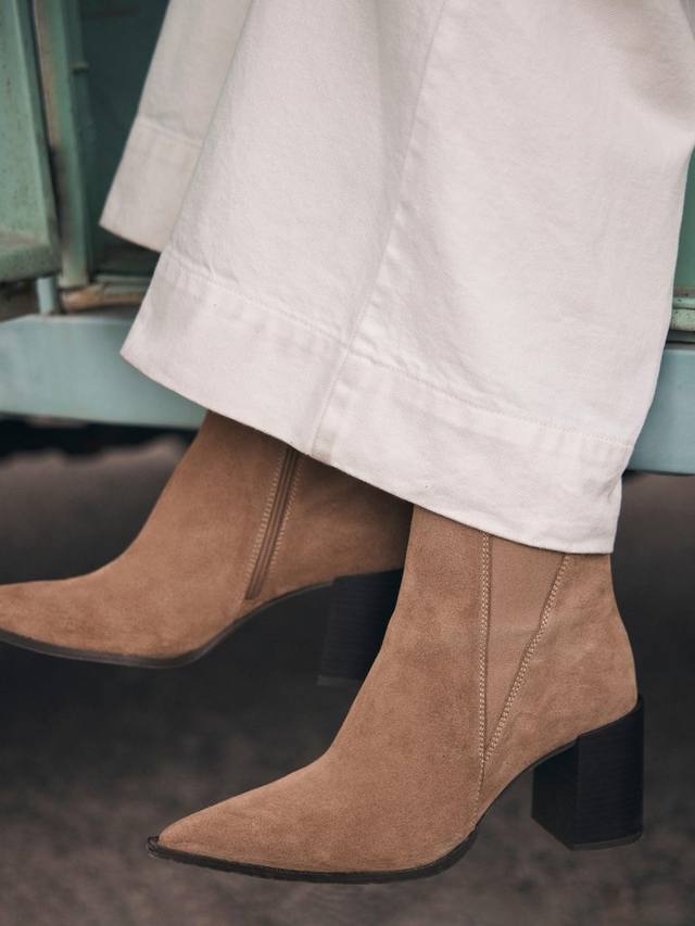 Пара замшевых ботильонов, созданных для повседневного ношения или торжественных случаев. Блочный каблук и заостренный закрытый носок добавляют изысканности, а застежка-молния обеспечивает удобство и безопасность.