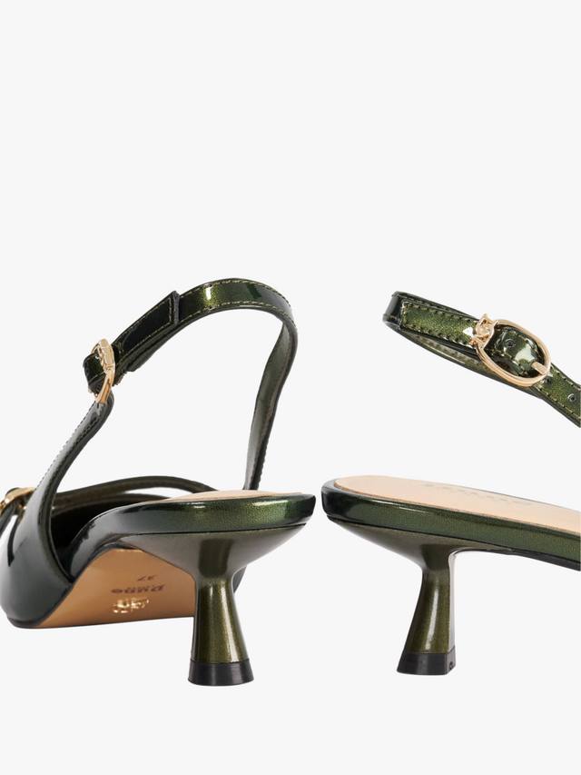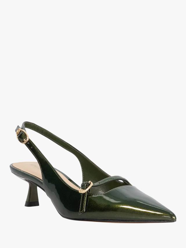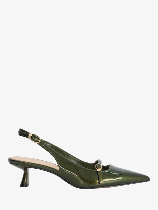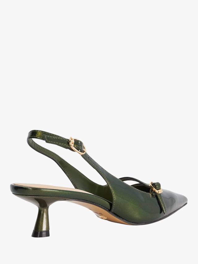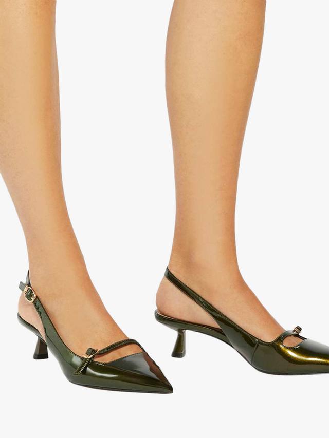 Туфли-лодочки Dune London с острым носком. Средний каблук-рюмочка добавляет комфортную высоту, а застежка-пряжка с открытой пяткой обеспечивает надежную посадку. Глянцевая поверхность сочетается с любым нарядом, делая их идеальными для более официальных повседневных мероприятий.