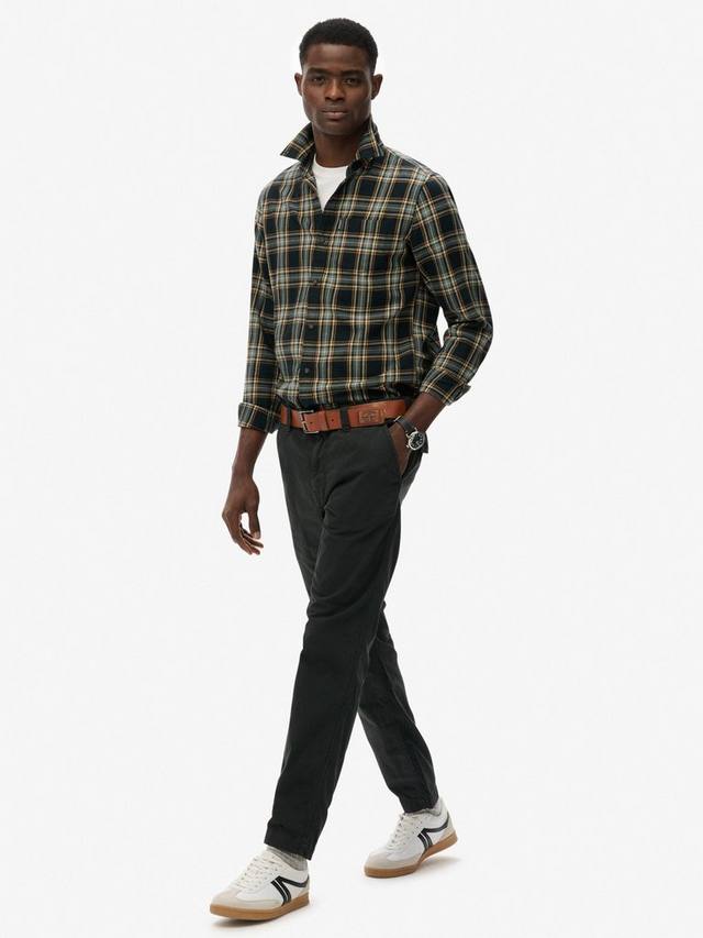 Эти брюки с современным зауженным кроем представляют собой современную интерпретацию классики. Они комфортно сидят на бедрах и плавно сужаются к щиколотке, создавая четкий, приталенный силуэт, который легко подобрать для любого случая. Пояс оснащен шлевками для ремня и застежкой на молнию и пуговицу, а четыре внешних кармана подчеркивают аутентичный практичный стиль брюк. Завершающий штрих — небольшая фирменная нашивка сзади на поясе.